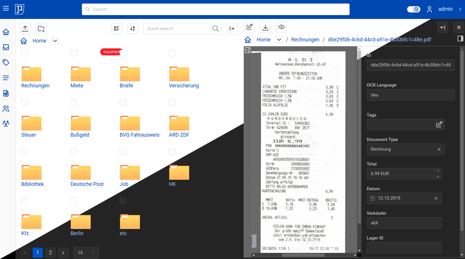 Papermerge DMS performs optical character recognition, abbreviated OCR, on your documents, adding searchable and selectable text, even to documents scanned with only images. It uses open-source Tesseract engine to recognize more than 100 languages.